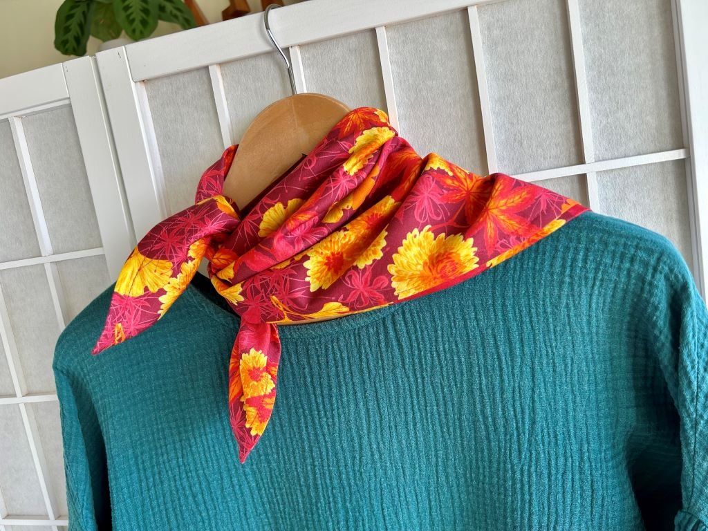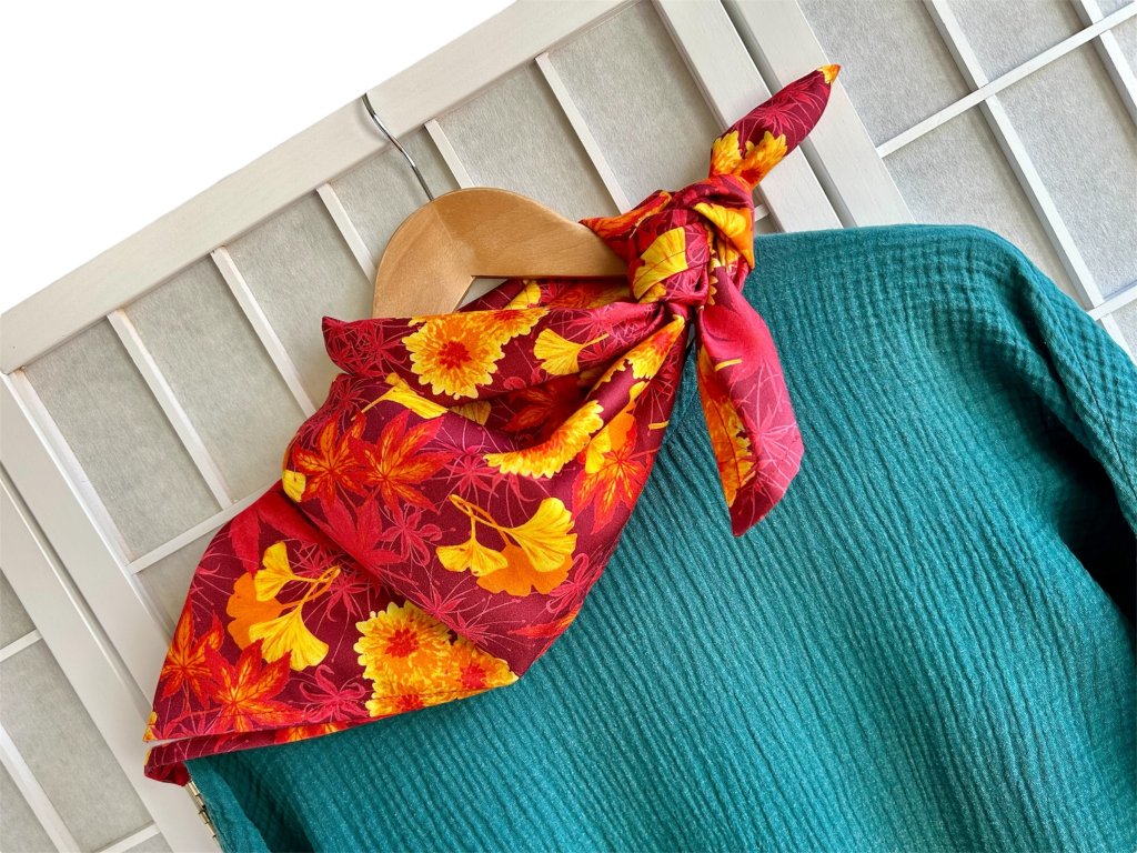 - šátek je multifunkční a využijete ho nejen jako praktický módní doplněk, ale i jako ubrus na stůl nebo na balení dárků technikou furoshiki
