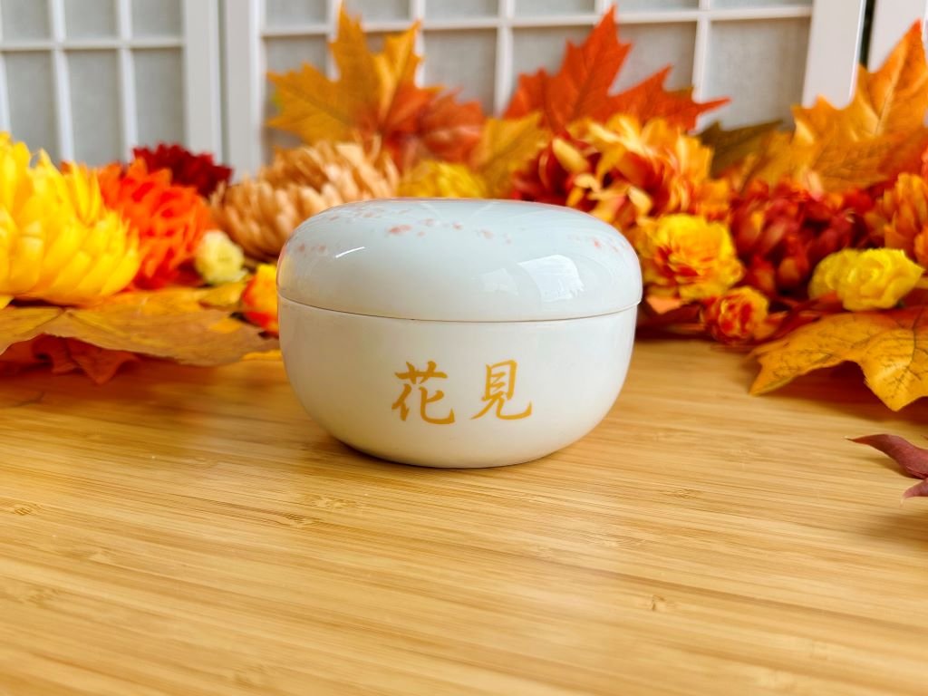 - porcelánová dóza ozdobená ozdobený ruční malbou kvetoucí sakury a reprodukcí mých perokreseb zlatých květů sakury