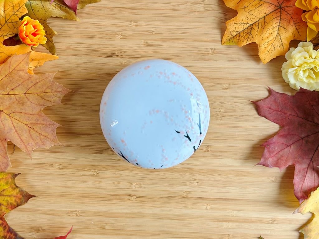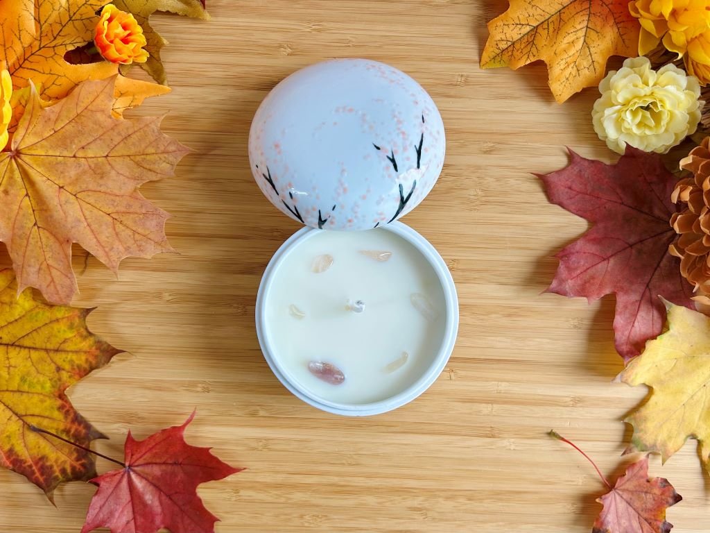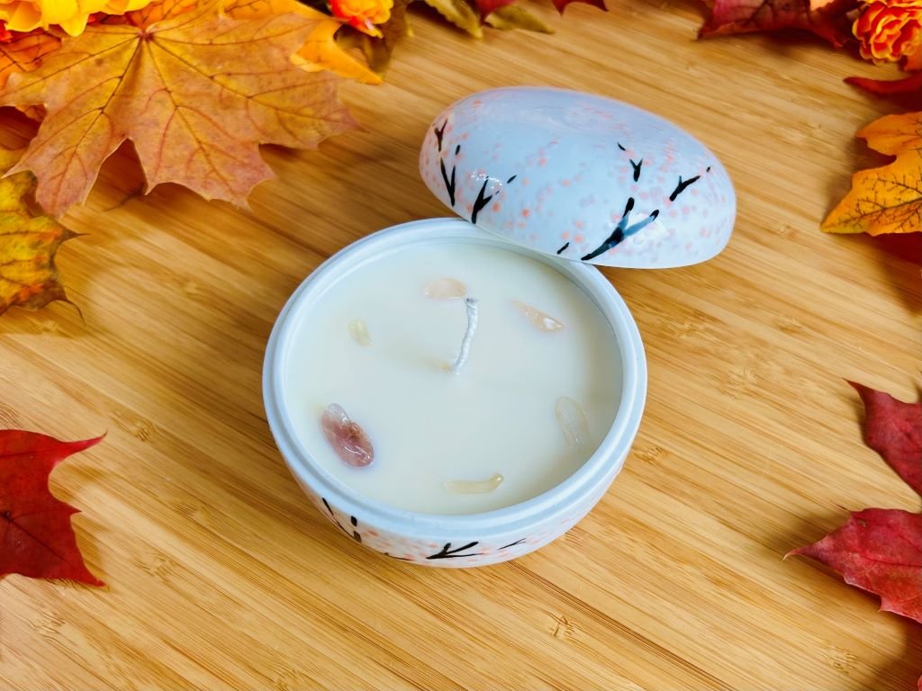 Porcelánová dóza ozdobená ruční malbou kvetoucích sakur naplněná sojovou svíčkou a minerály