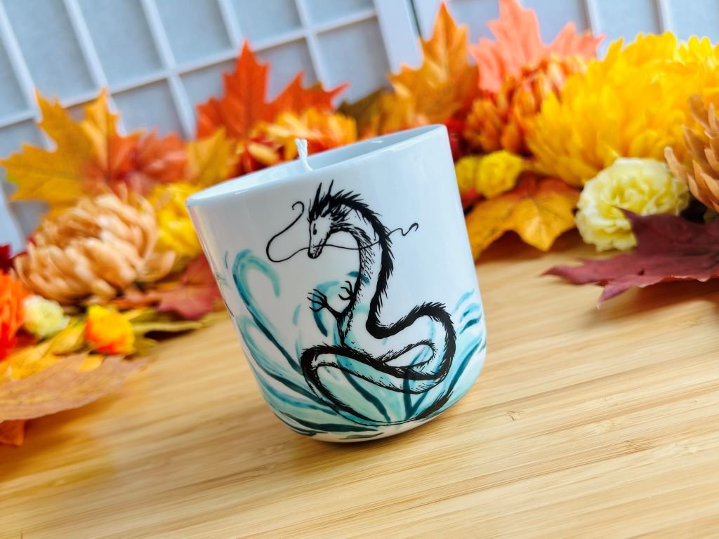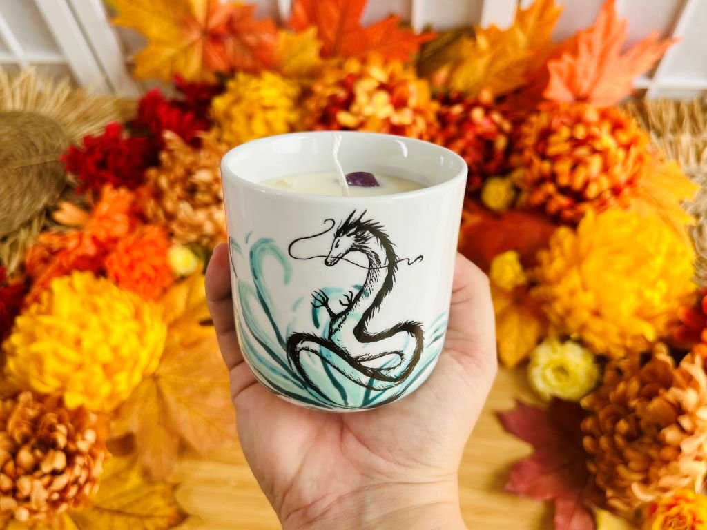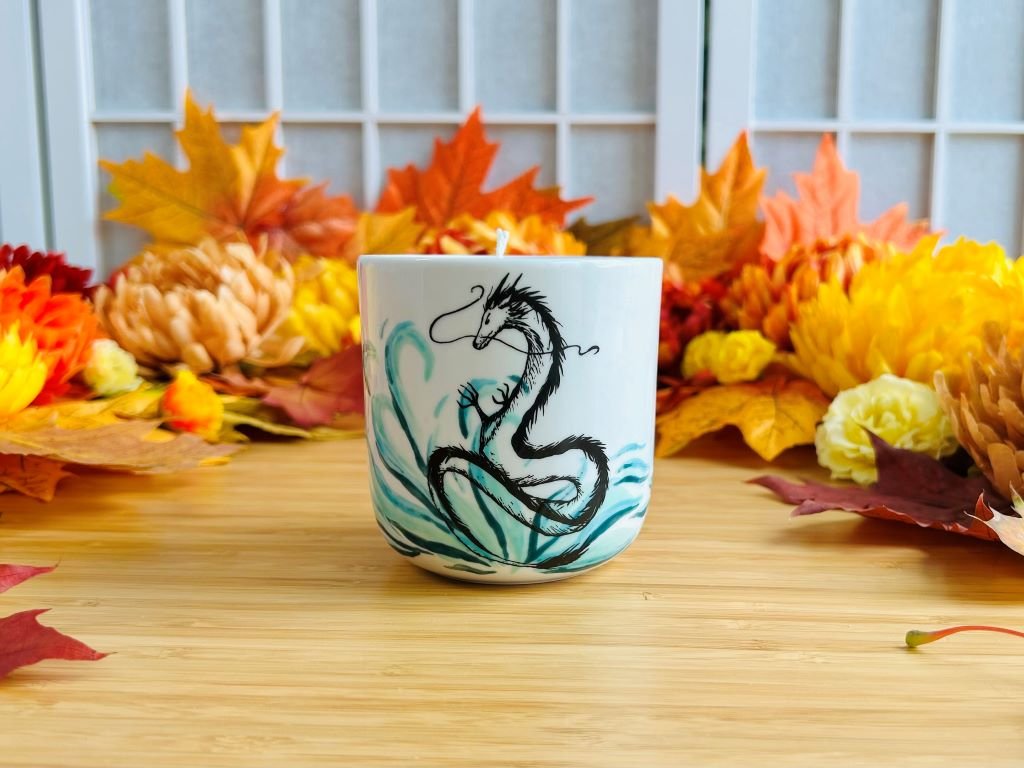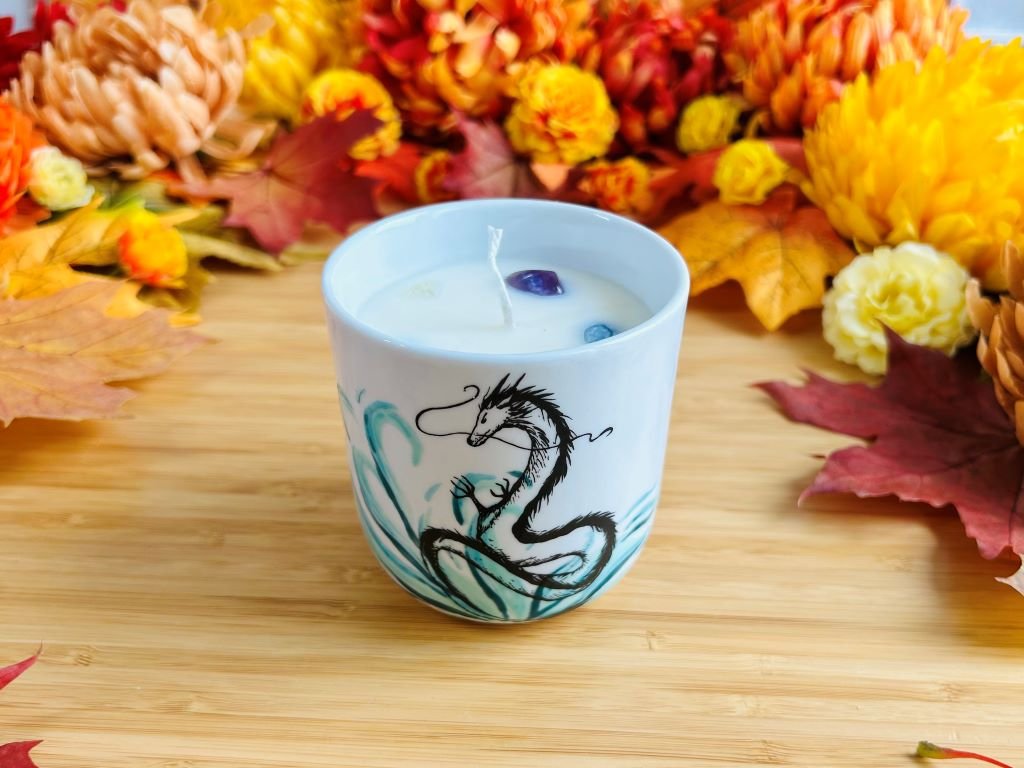 Porcelánový pohárek s japonským vodním drakem naplněný sojovou svíčkou a minerály