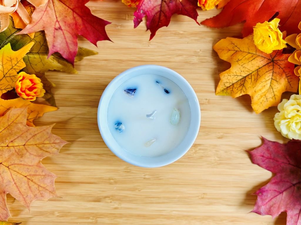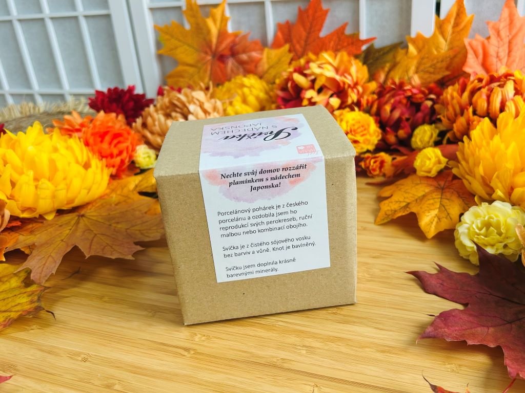 Svíčka v porcelánovém pohárku s koi kapříky doplněnou minerály