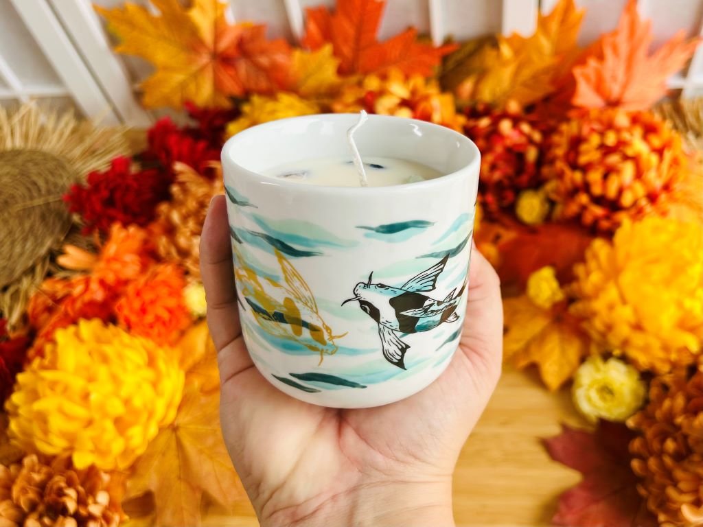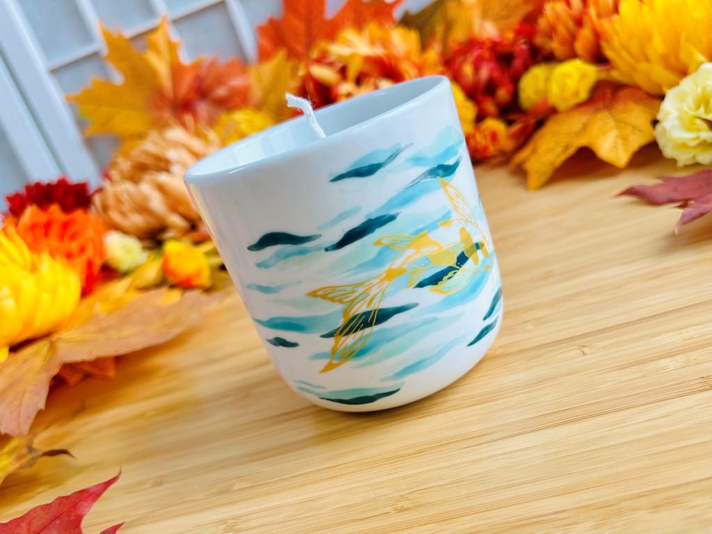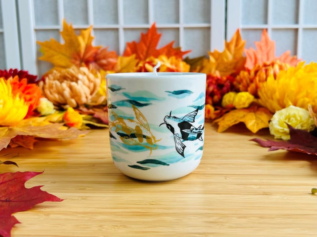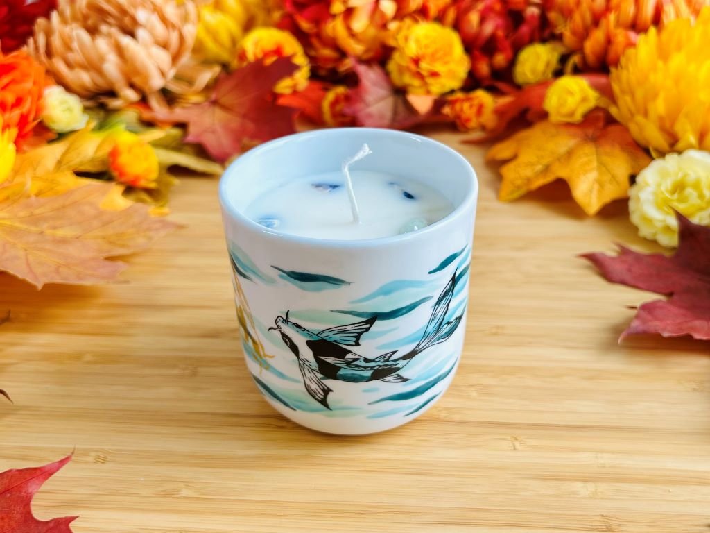Porcelánový pohárek s koi kapříky naplněný sojovou svíčkou a minerály