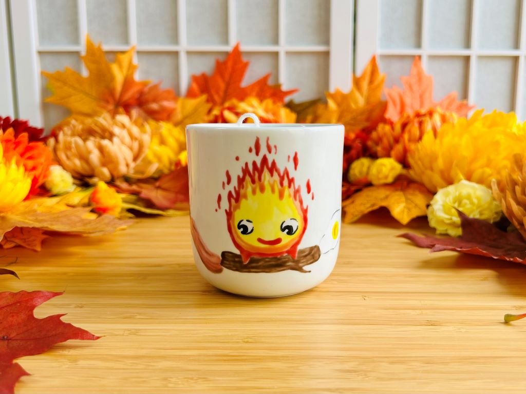 - porcelánový pohárek s ruční malbou malého ohýnku Kalcifera inspirované klasickým animovaným filmem Zámek v oblacích