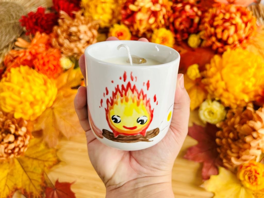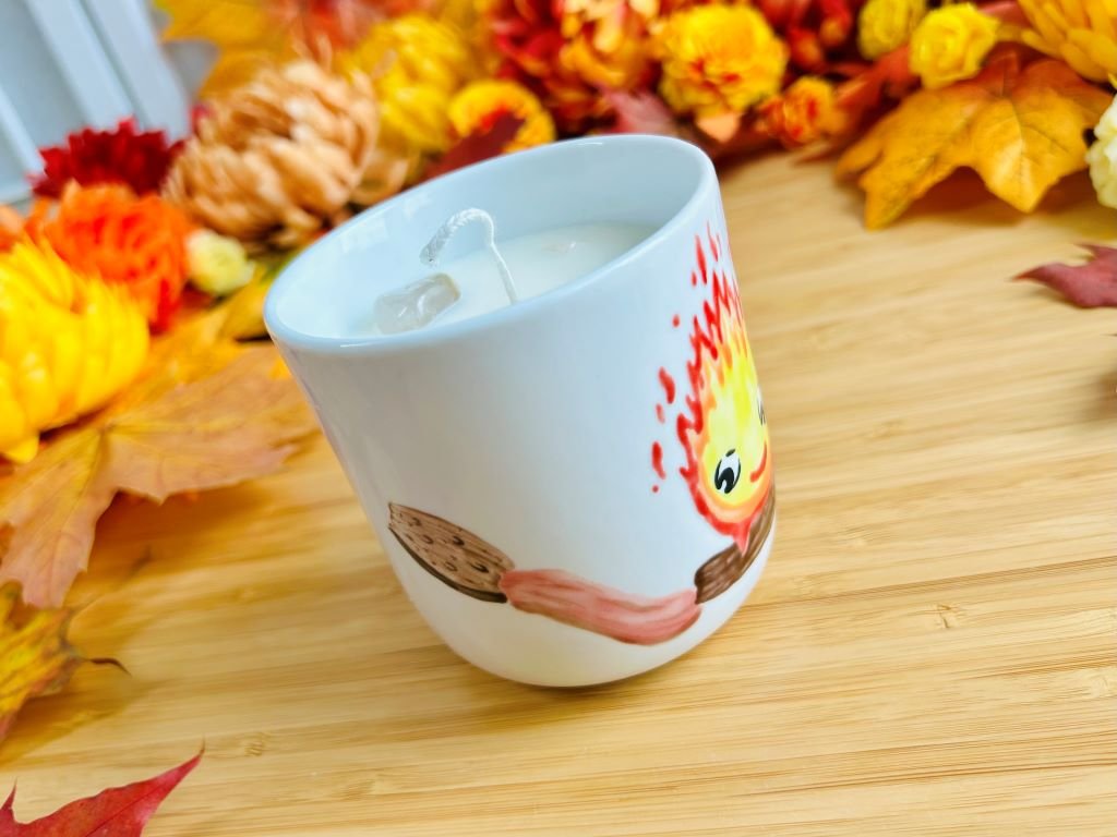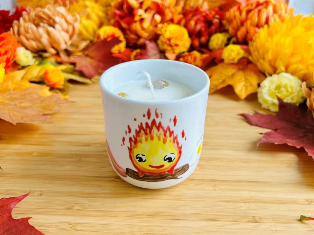 Porcelánový pohárek ručně malovaný s Kalciferem z animovaného japonského filmu Zámek v oblacích naplněný sojovou svíčkou a minerály