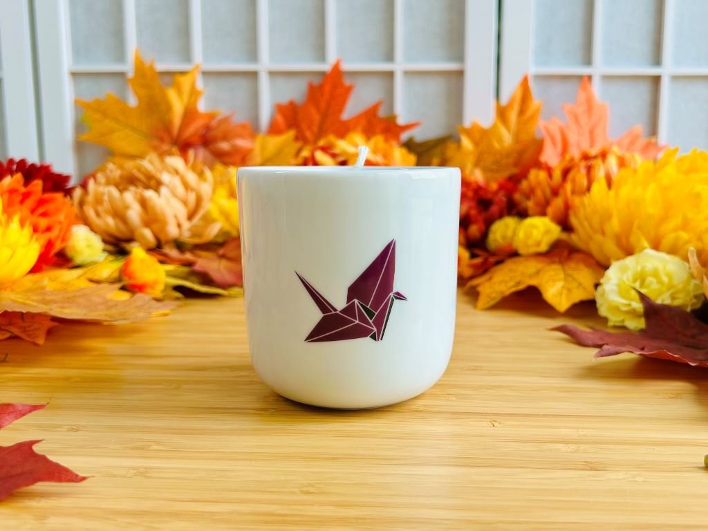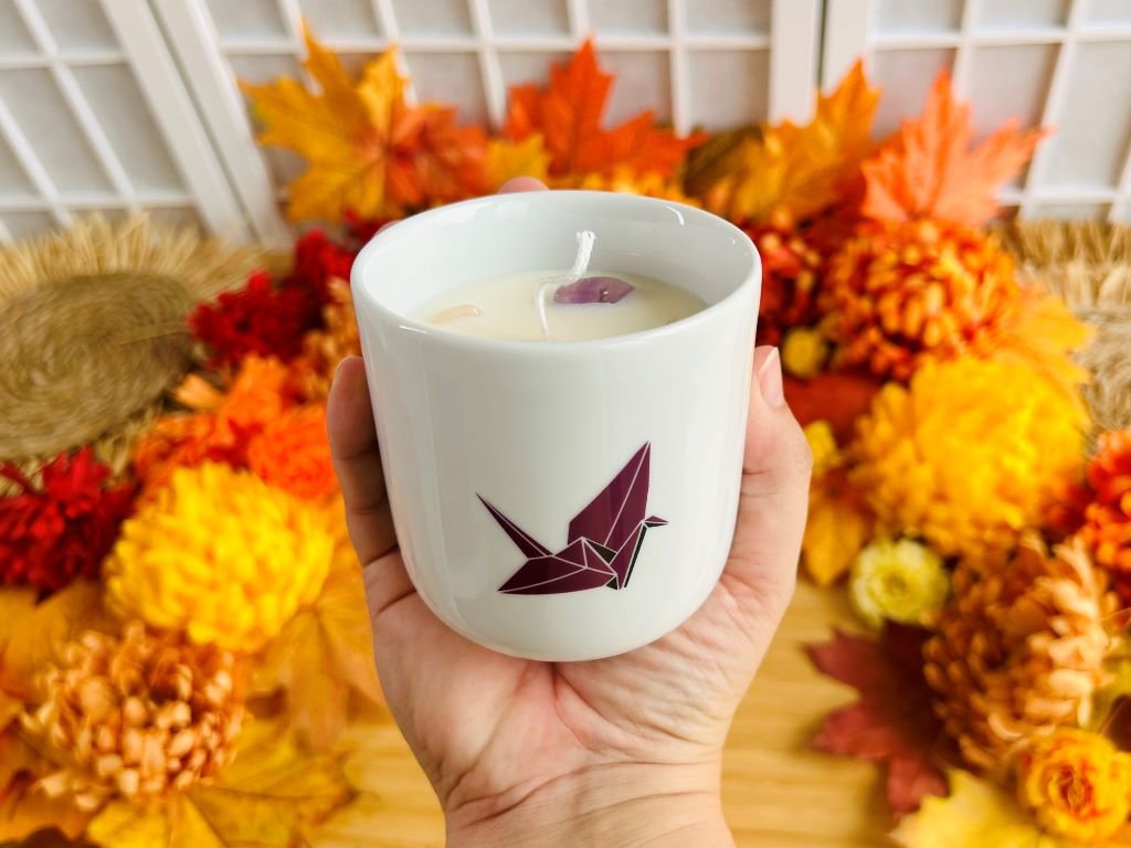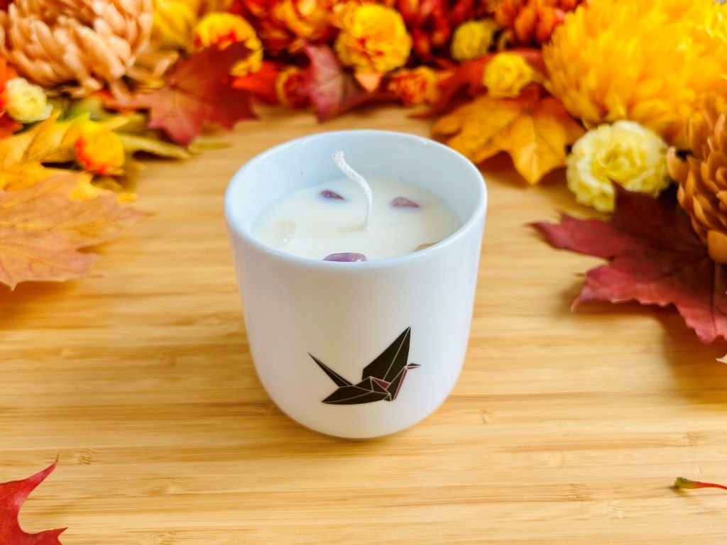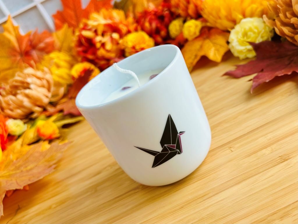 Svíčka v porcelánovém pohárku s origami jeřábem doplněnou minerály
