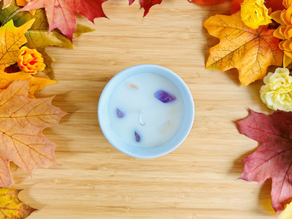 Porcelánový pohárek s origami skládankou naplněný sojovou svíčkou a minerály
