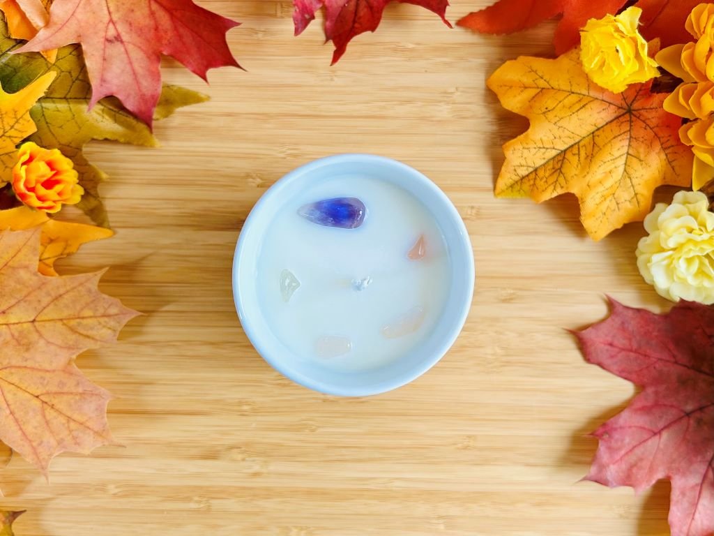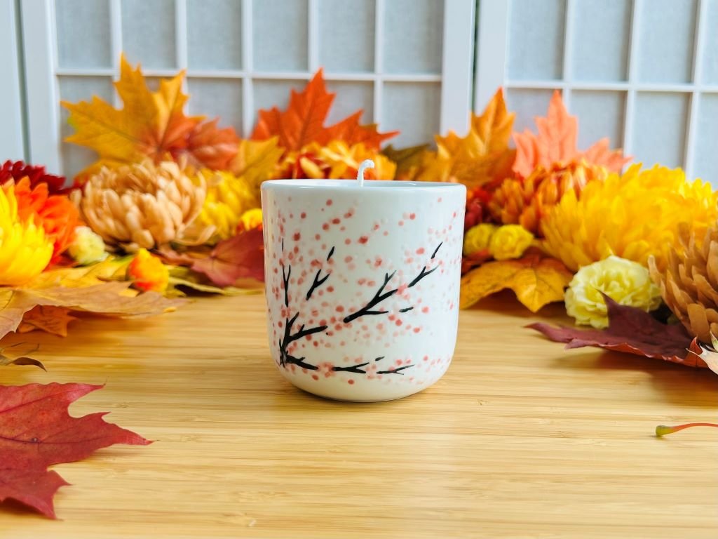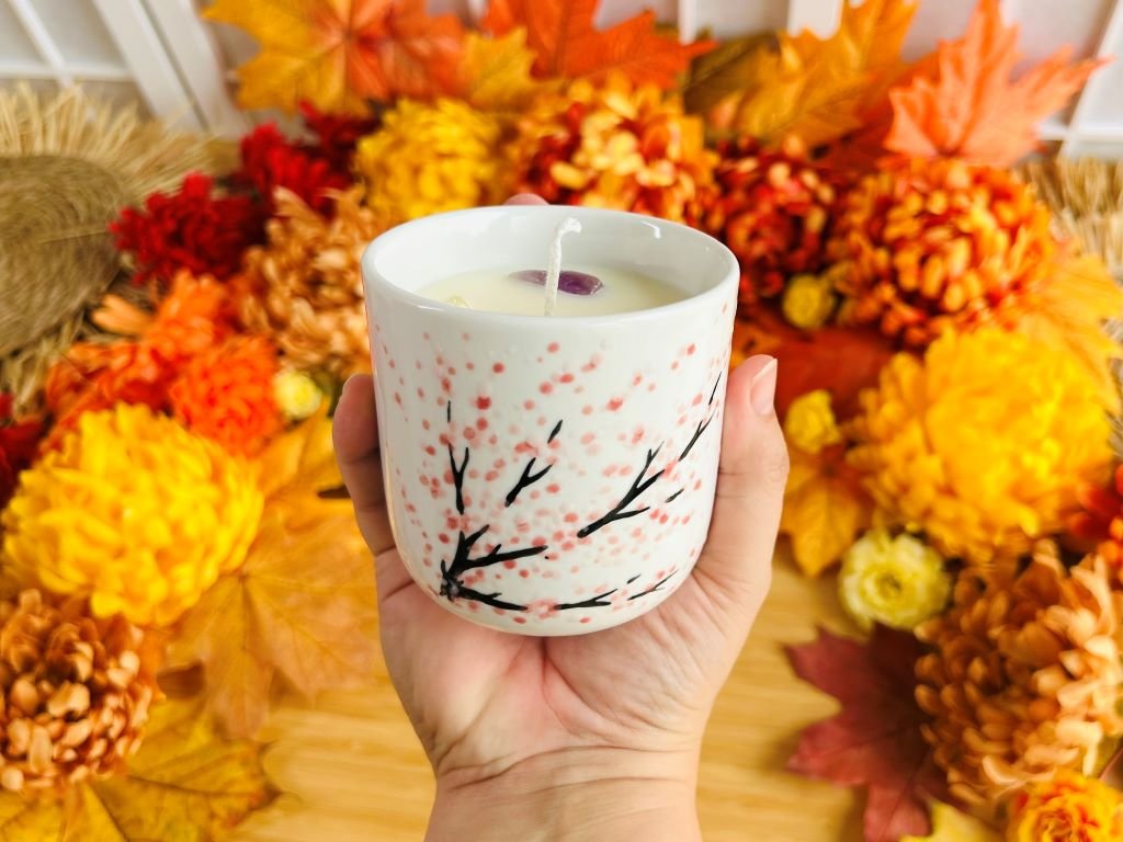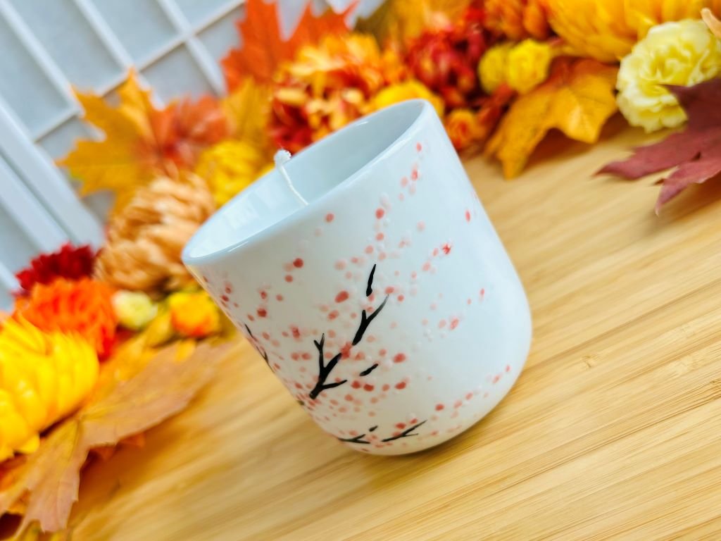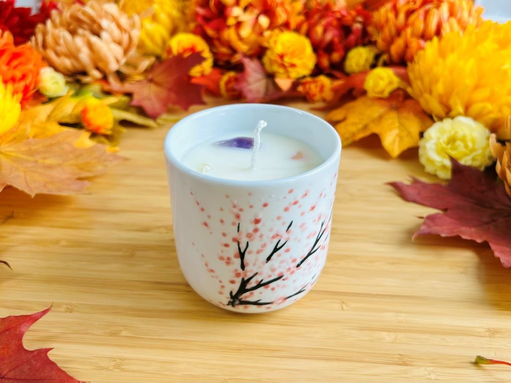Porcelánový pohárek ozdobený ruční malbou kvetoucích sakur naplněný sojovou svíčkou a minerály