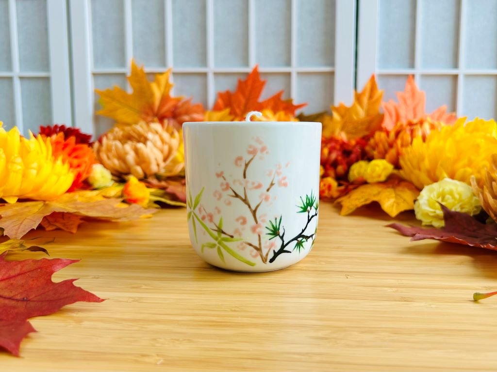 - porcelánový pohárek ozdobený ruční malbou bambusu, borovice a slivoně