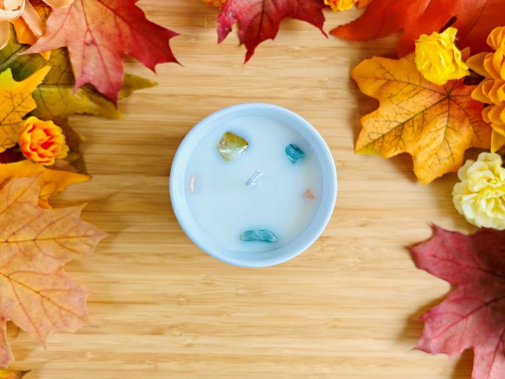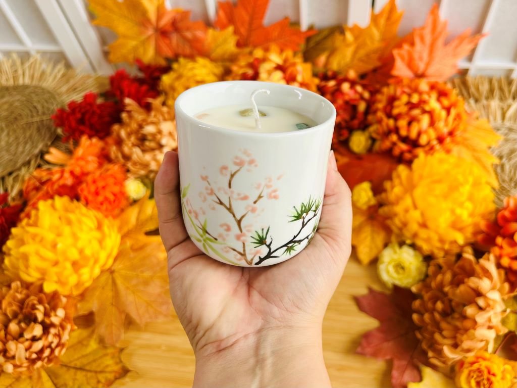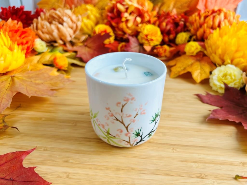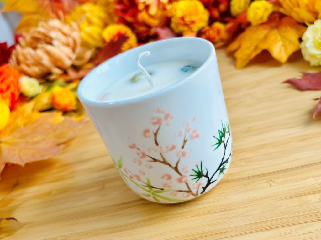 Porcelánový pohárek s Třemi přáteli zimy naplněný sojovou svíčkou a minerály