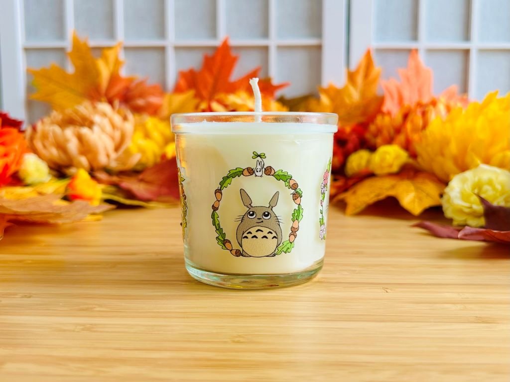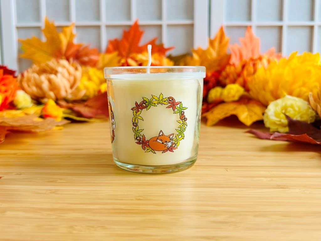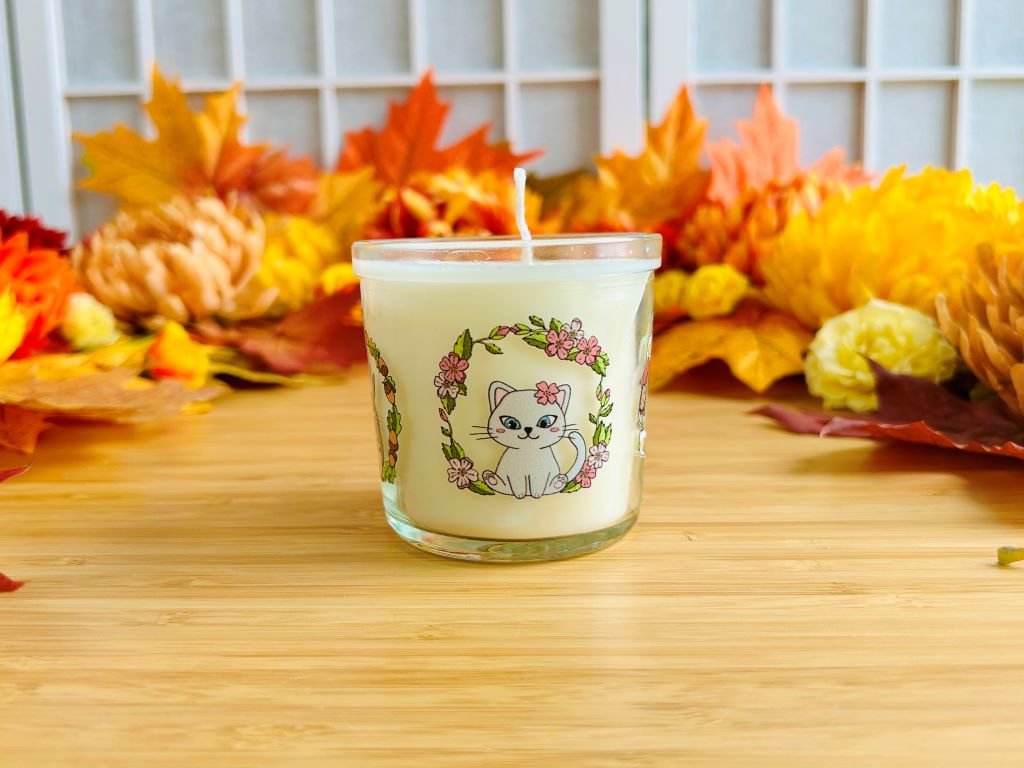 Sklenice s roztomilými zvířátky ve věnečku naplněná sojovou svíčkou