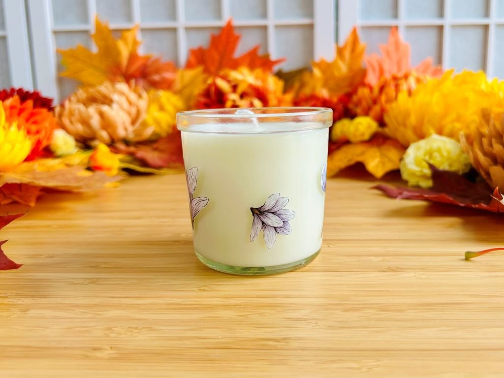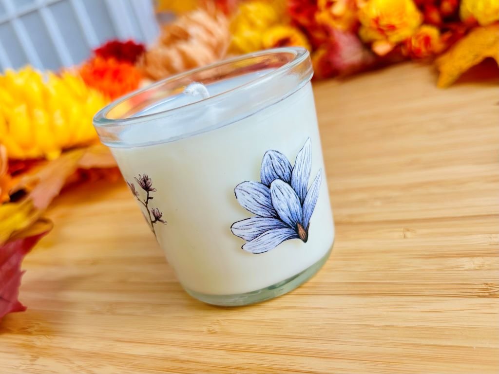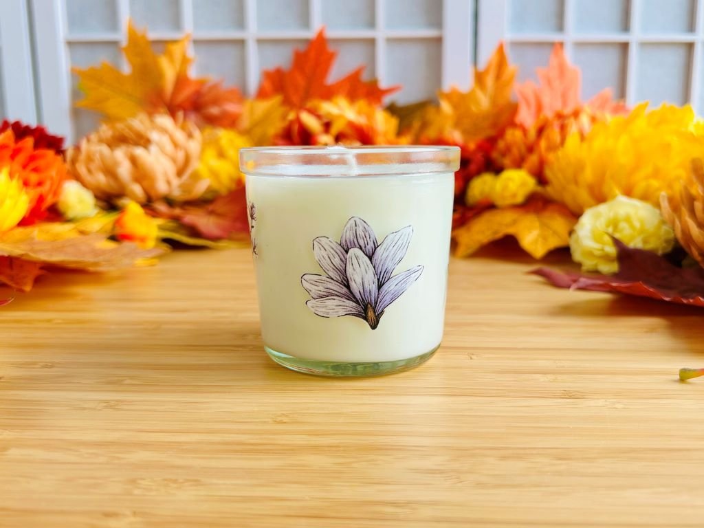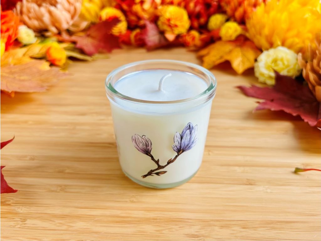 Sklenice s rozkvetlými květy magnolie naplněná sojovou svíčkou