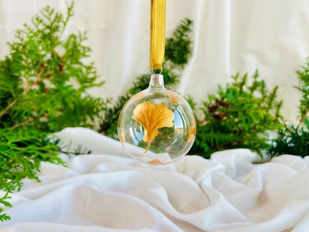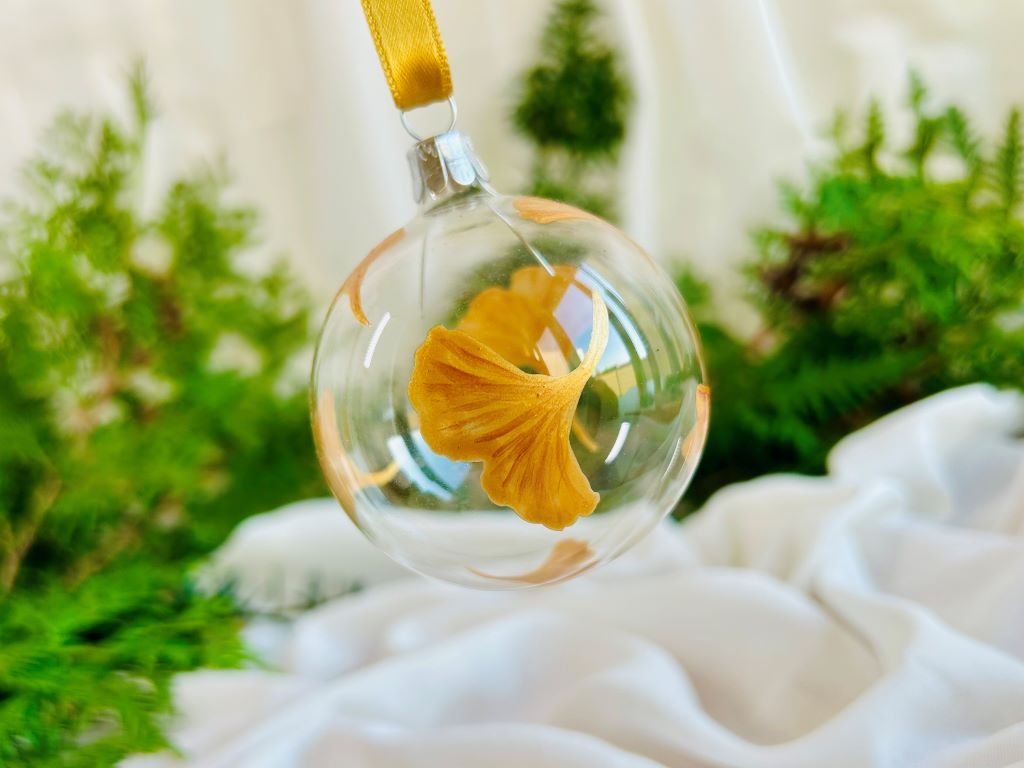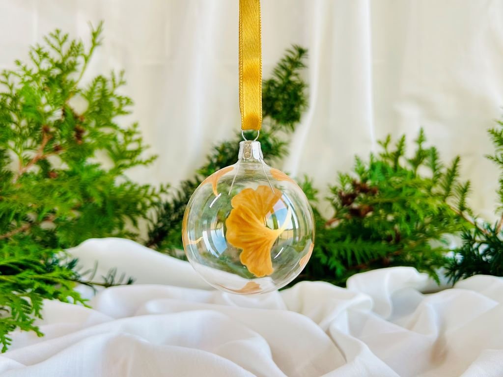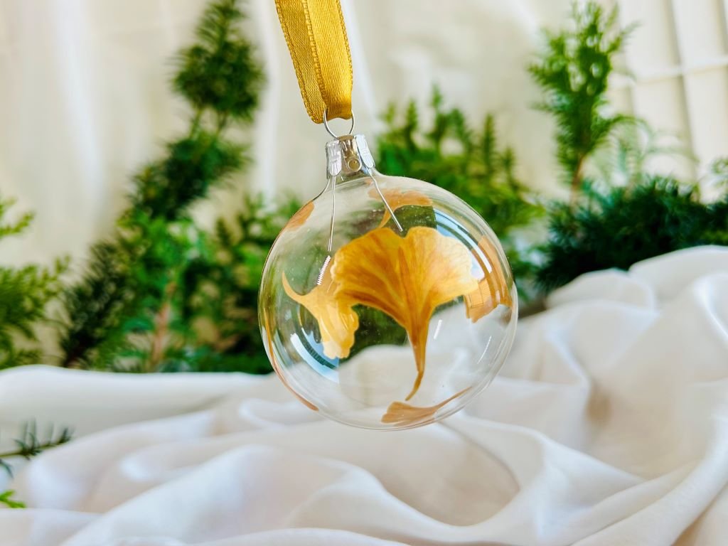 Vánoční koulička z českého skla s ručně namalovanými ginkgo listy