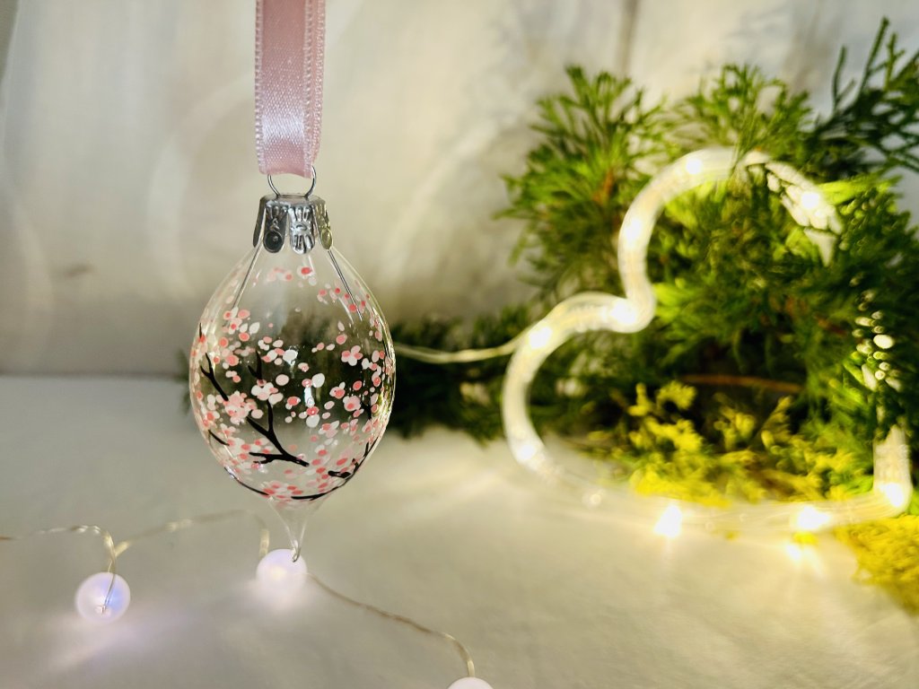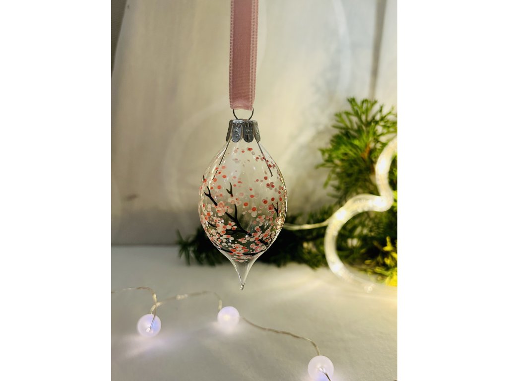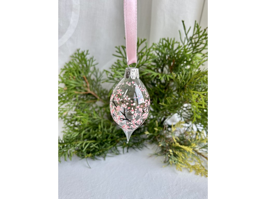 Vánoční koulička ve tvaru olivy z českého skla s ručně namalovanou kvetoucí sakuru