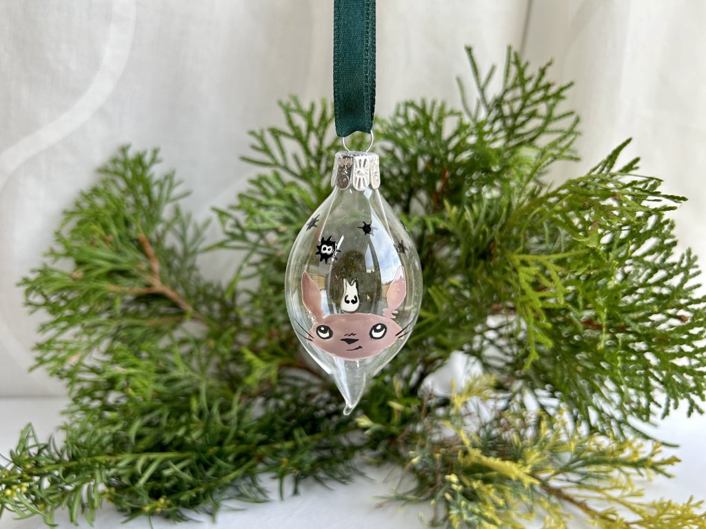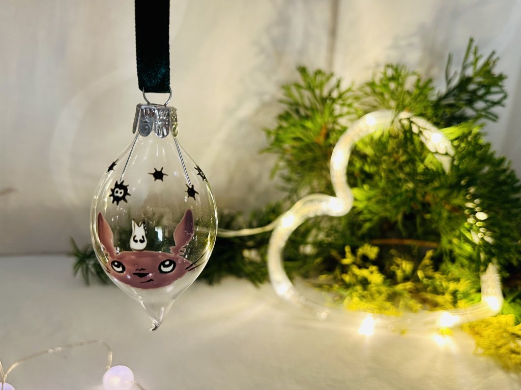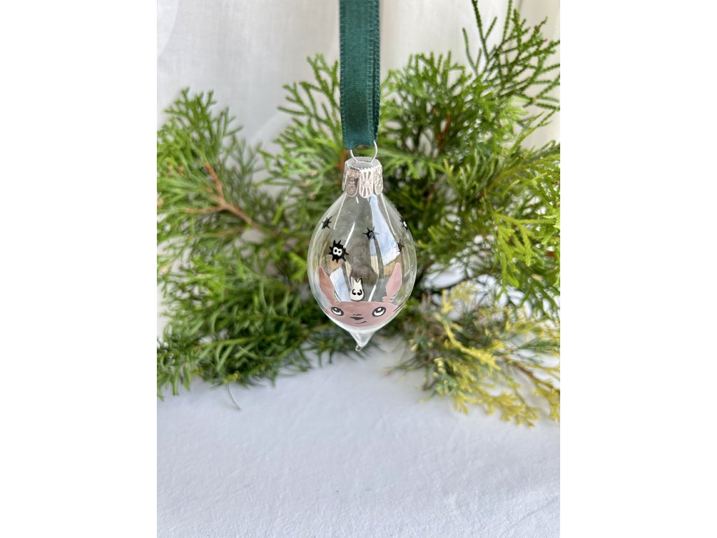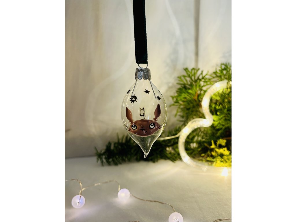 Vánoční koulička ve tvaru olivy z českého skla s ručně namalovaným lesním duchem Totorem a černočerňáky