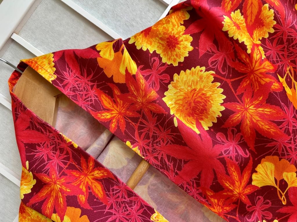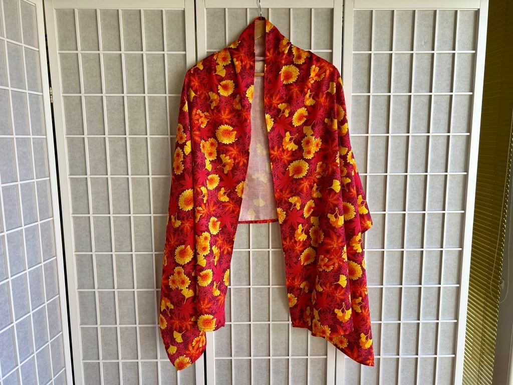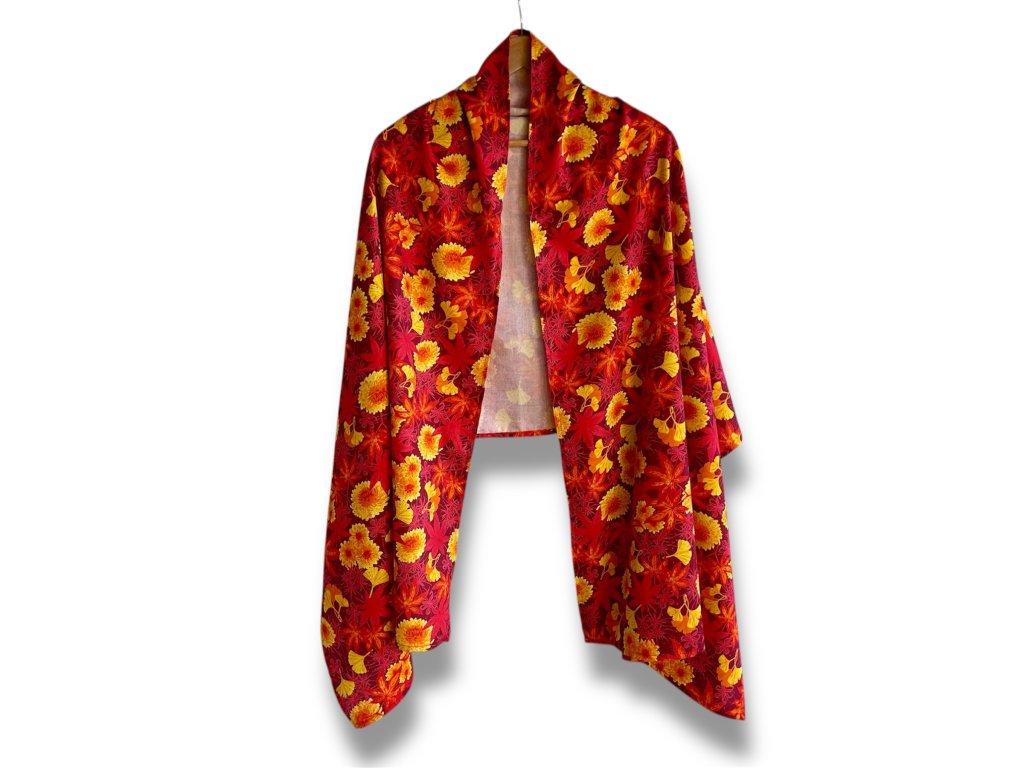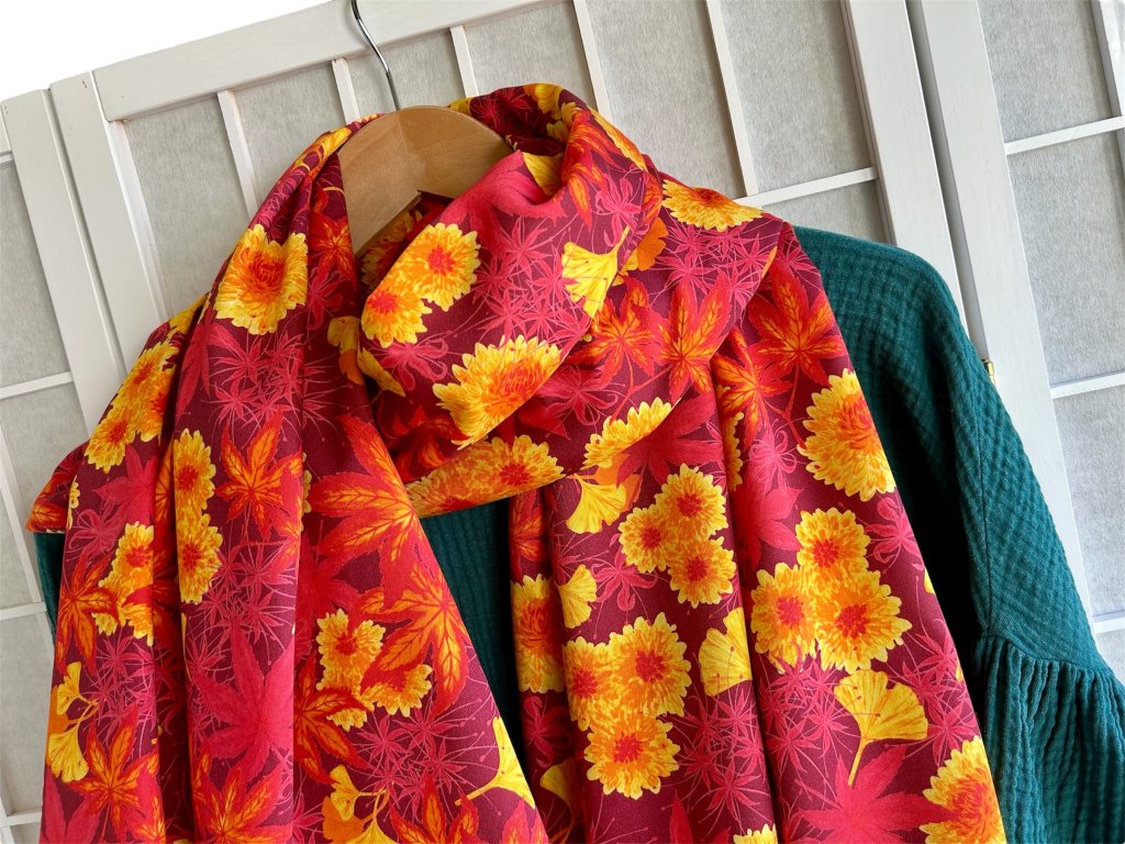 Velká elegantní šála plná kvetoucích chryzantém, javorových listů, listů stromu ginkgo a pavoučí lilií