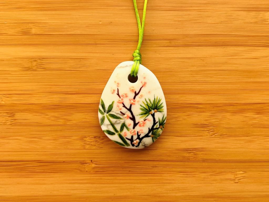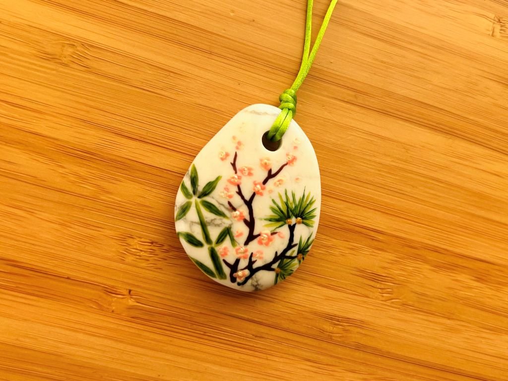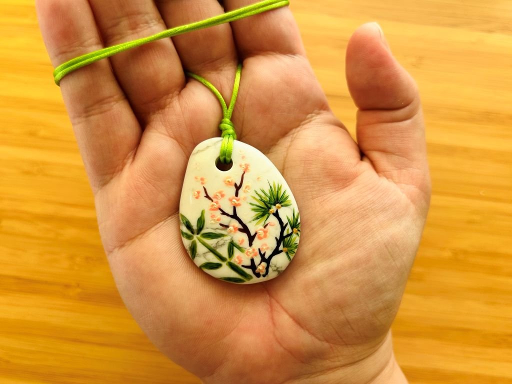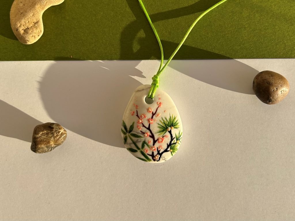 Velký náhrdelník z magnezitu s ručně namalovaným bambusem, borovicí a slivoní