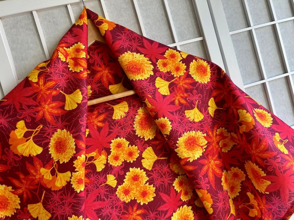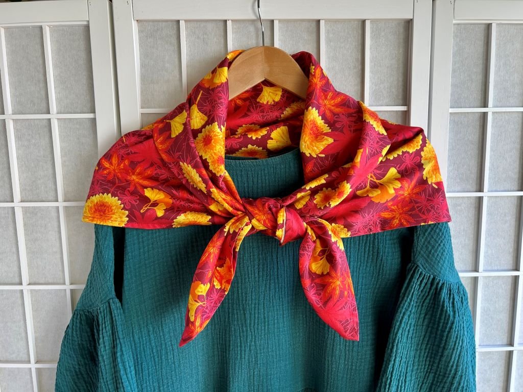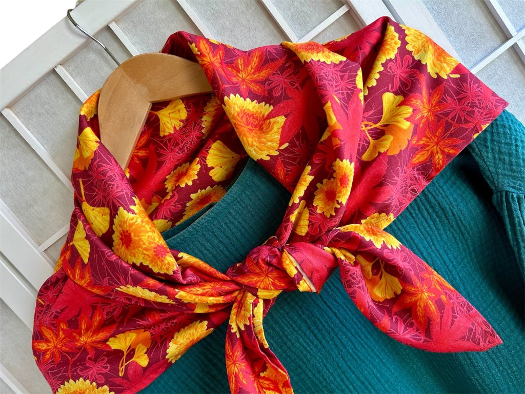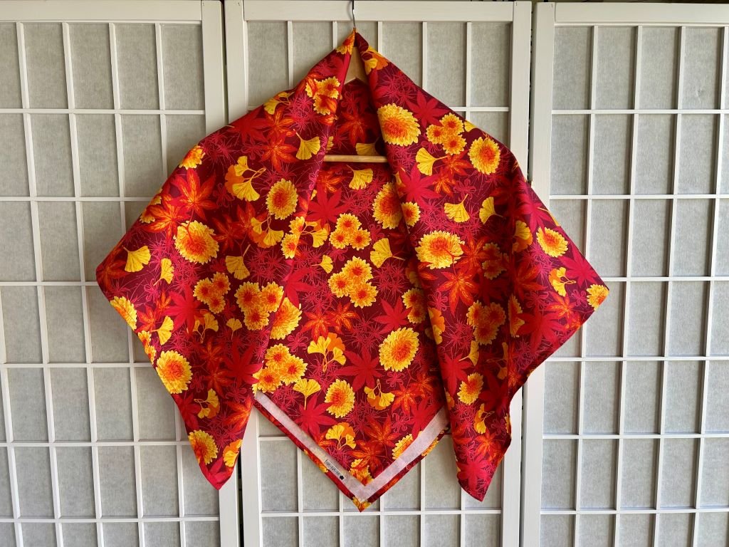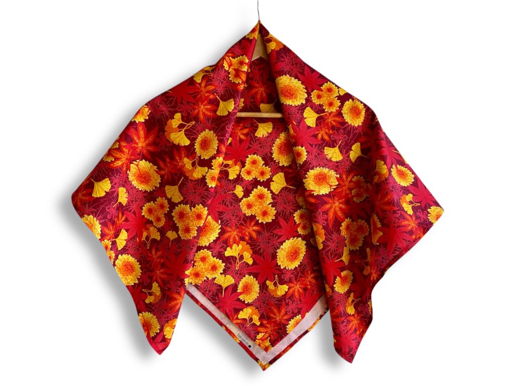 Velký šátek plný kvetoucích chryzantém, javorových listů, listů stromu ginkgo a pavoučí lilií